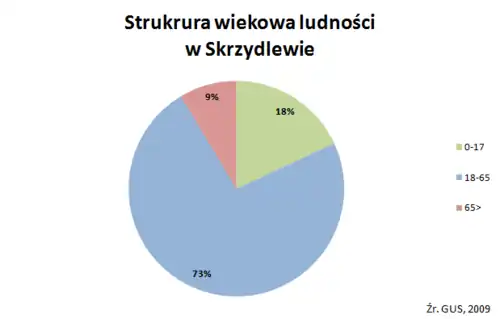 Struktura wieku wsi jest względnie stabilna. Skrzydlewo wyróżnia drugi pod względem wysokości odsetek zamieszkałej ludności w wieku produkcyjnym (18-64) w gminie, wynoszący 73,3%[10][c]. Wskaźnik obciążenia demograficznego jest niewysoki i wynosi zaledwie 11,7 osób w wieku poprodukcyjnym na 100 osób w wieku produkcyjnym. Niepokojący jest natomiast odsetek dzieci i młodzieży (<18 roku życia), wynoszący w 2009 roku 18,1%, czyli mniej niż średnia powiatowa (21,1%) i gminna (20,5%). W związku ze postępującym procesem starzenia się społeczeństwa, prognozować można dalsze wyludnianie się miejscowości, poprzez intensywniejszy wzrost osób wchodzących z wieku produkcyjnego w wiek poprodukcyjny oraz malejącą liczbą urodzeń.