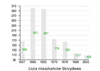 Według spisu z roku 1837, w wiosce doliczono się 166 dusz. Liczba ta niemal podwoiła się pół wieku później. Wówczas w Skrzydlewie mieszkała rekordowa liczba 301 mieszkańców, co kwalifikowało w tamtych czasach wieś jako dużą. Ostatnimi czasy miejscowość sukcesywnie się wyludnia. W 1970 roku liczyła 174 osób, a 18 lat później o 1/3 mniej[5].