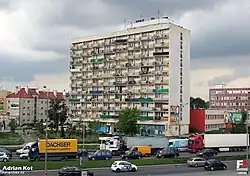 - ↑ Dom rotacyjny został wybudowany na zlecenie przedsiębiorstwa Elwro w latach 1976–1979. W budynku znajdowało się 120 mieszkań.