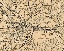 - Mapa – Smoligów w lewym dolnym rogu po powiększeniu mapy. Mapa pochodzi z 1889 lub 1891 roku (oryginalne arkusze opublikowane około 1910 roku) – przegląd map wojskowych Austro-Węgier. Przypis z 1891 r. – objaśnienia skrótów – H.O. Hochofen (Topialnia, huta zelazna); Hm. Hammerwerk (Kuznica); Z.O. Ziegelofen (Piec cegielny); Z.S. Ziegelschlag (Cegielnia); K.O. Kalkofen (Piec wapienny); H.H. Herrenhaus (Gospodskÿ Dwor); Chutor Chut.Ch. Ferme F. (Meierhof); H. Höhle (Jaskinia); Fb. Fabrik; Kls. Kloster (Klasztor); Schl. Schloss (Zamek); M.H. Meierhof (Folwark); W.H. Wirtshaus (Karczma); J.H. Jägerhaus (Lesniczówka); R. Ruine.