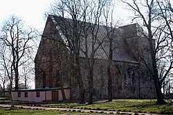- Kościół Narodzenia NMP - jednonawowy na rzucie prostokąta o wymiarach 20 × 9,3 m, bez chóru, wzniesiony w 2 połowie XIII w. z granitowej kostki układanej w regularnym wątku, z masywną zachodnią wieżą o szerokości równej nawie. Pierwsza wzmianka z 1337, w XIV w. nadbudowano wieżę oraz wzniesiono kruchtę południową; w 1716 (lub 1726[31]) wieża otrzymała nowe barokowe zwieńczenie. W 1886 zmieniono wystrój średniowiecznego wnętrza nadając mu kształt neogotycki. W 1905 parcelę kościelną otoczono kamienno-ceglanym murem. W 1945 kościół został zbombardowany przez Armię Czerwoną, odbudowany z zachowaniem wczesnogotyckiej formy (nie odbudowano barokowego zwieńczenia wieży) w latach 1983–1984 przez mieszkańców pod nadzorem salezjanina ks. Wiesława Dąbrowskiego. Konsekrowany został 08.12.1984.