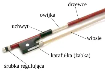 Smyczek składa się z drzewca będącego elementem nośnym wykonanym z bardzo trwałego drewna (fernambuku, tabebuja), uchwytu, włosia i śruby naciągowej (żabka), pozwalającej uzyskać odpowiedni naciąg włosia, niezbędny do poprawnej gry.