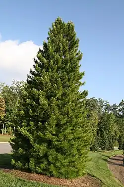 - W stanie dzikim dorasta do 40 m wysokości (po 30 latach osiąga zwykle ok. 10 m)[5], w Polsce osiąga zwykle 7-8 m. Korona gęsta, stożkowata, u starszych osobników szeroka[5].