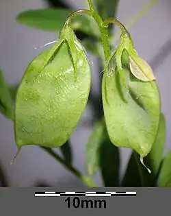 - Zwisający strąk o długości 8–15 mm. Zawiera 1–3 dość duże, płaskie nasiona o ostrych brzegach.