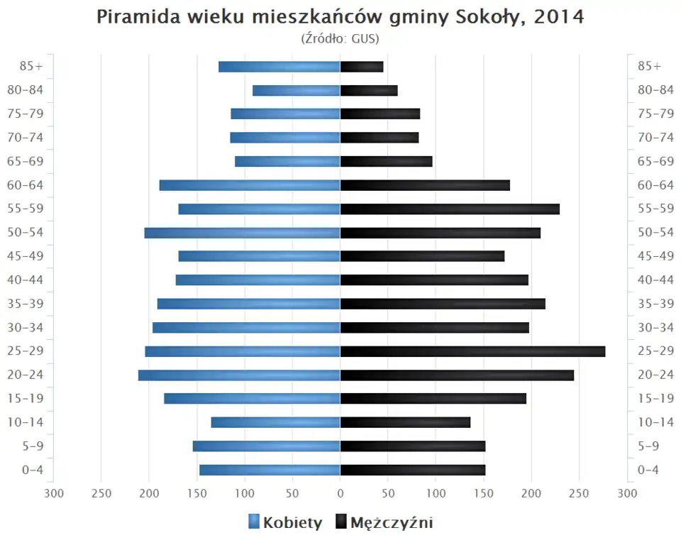 - Piramida wieku mieszkańców gminy Sokoły w 2014 roku[1].