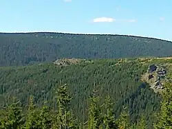 ![]() Widok ze szczytu góry Prostřední vrch na szczyty Malý Děd i Kamzičí vrch (poniżej Sokol oraz Sokolí skála (1)) (2016 rok) | |