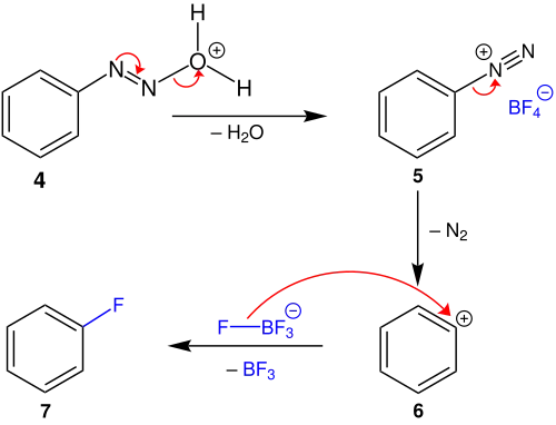Powstały tetrafluoroboran diazoniowy po osuszeniu ogrzewa się, doprowadzając do jego rozkładu termicznego:
