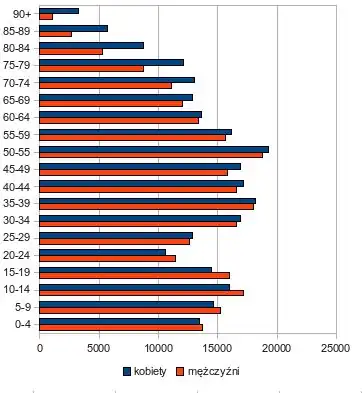 Wykres przedstawia piramidę wiekową dla hrabstwa Somerset (dane na rok 2001)[69]