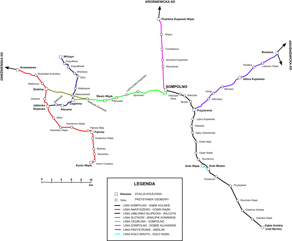 W 1991 roku pod zarząd Sompolińskiej Kolei Dojazdowej oddano 7 linii kolejowych o prześwicie 750 mm i łącznej długości ok. 110 kilometrów. Po jej zamknięciu w 2001 roku, linie: Anastazewo – Złotków, Złotków – Biskupie Konińskie, Biskupie Konińskie – Sompolno, Sompolno – Przystronie oraz Sławoszewek – Wilczyn przejęła Gnieźnieńska KD, a odcinki Przystronie – Boniewo, Przystronie – Koło Miasto i Koło Miasto – Koło Wąskotorowe – Krośniewicka KD[4]. W związku ze spadkiem przewozów, linie te od 2001 roku są sukcesywnie demontowane.