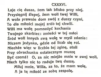 - ↑ Maria Sułkowska (MUS): Sonety Shakespeare’a I-CXXXIV i CXXXVII-CLIV. Kraków: G. Gebethner i spółka, 1913. Cytat: Sonety: CXXXV i CXXXVI nie zostały przetłomaczone z następującego względu: Treścią ich jest gra wyrazów, polegająca na identycznym brzmieniu w języku angielskim wyrazu wola »will«, oraz »Will«, zdrobnienia imienia własnego »William« Wilhelm. Było to imię nietylko Shakespeare’a, ale także, jak z treści tych dwóch opuszczonych sonetów wynika, przyjaciela Shakespeare’a, »pana W. H.« (dedykacya pierwszego angielskiego wydawcy sonetów). Oczywiście gra wyrazów przetłomaczyć się nie da, a odsyłanie czytelnika do przypisków, za każdym użyciem wyrazu wola, byłoby dla czytelnika nużącym i sprzeciwiałoby się nadto zapatrywaniom tłomacza, który jest zdania, że poezya, nawet w tłomaczeniu, winna obchodzić się bez komentarzy..