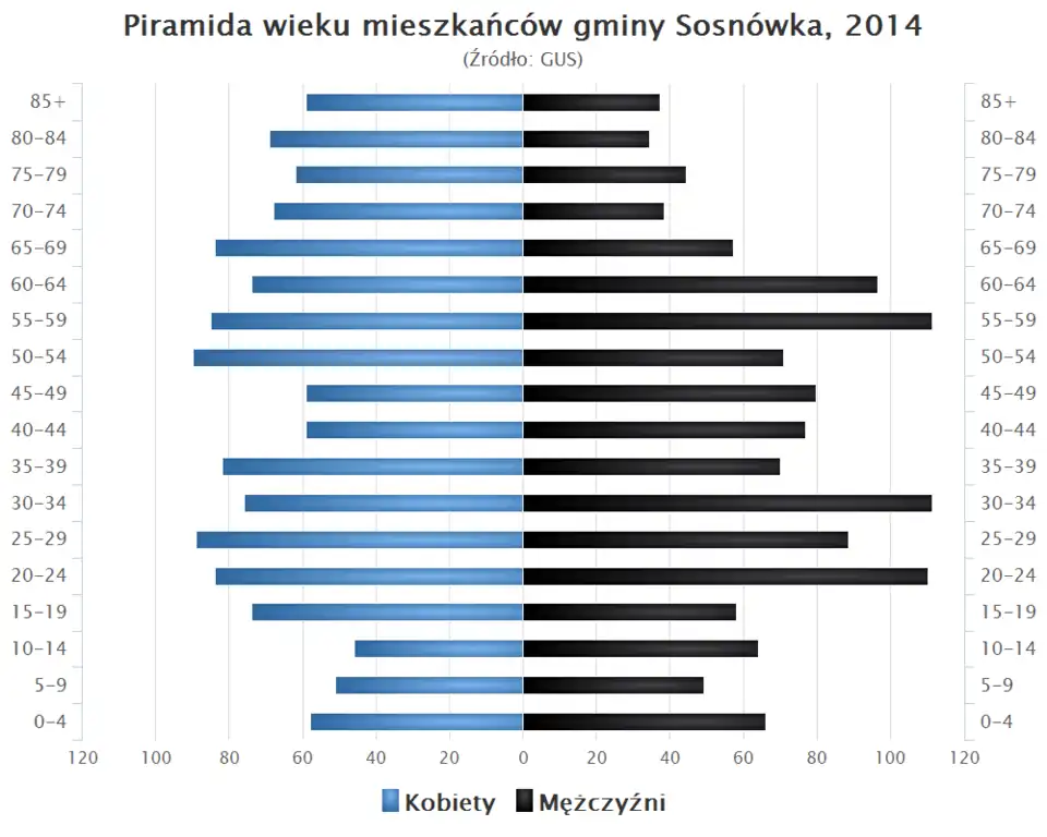 - Piramida wieku mieszkańców gminy Sosnówka w 2014 roku[1].
