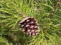 - Szyszki męskie zebrane w klastry przy szczytach gałązek. Dojrzałe szyszki nasienne długości 3–6 cm, jasnobrązowe, prawie symetryczne. Wyrastają pojedynczo lub w parach, rzadko w okółkach. Łuski szyszek cienkie i giętkie. Apofyza z piramidką zakończoną delikatnym, 2–4 mm kolcem.