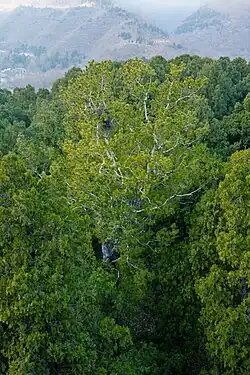 - Pojedynczy lub podzielony na wiele pni tuż przy podstawie. Osiąga wysokość 24–30 m, średnicę 116 cm (jeśli podzielony, łącznie średnica może dochodzić do 3 m[5]). Kora gładka, szarozielona, łuszczy się nieregularnymi, zaokrąglonymi płatami, odsłaniając bladożółte spodnie warstwy, które pod wpływem światła przybierają kolor rudobrązowy.