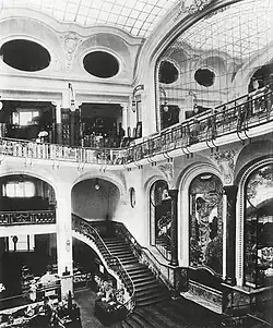 Wnętrze domu handlowego było zwieńczone beczkowym szklanym dachem o konstrukcji stalowej, kratownicowym, ozdobionym stiukowym sklepieniem i barokowymi lunetami. Podłogi wyłożone były dębowym parkietem, a na ścianach znajdowały się mozaiki, reliefy, kryształowe lustra i kute secesyjne balustrady[58]. Secesyjny wystrój wnętrz został zaprojektowany przez Juliusa Koblinsky’ego. Do realizacji projektu zastosowano marmur, brąz, ceramikę, szkło, szlachetne drewno i klinkier. Dzięki licznym sztukateriom, reliefom i secesyjnym detalom wnętrze domu handlowego przypominało wnętrze pałacowe[47]. Od strony południowej usytuowano komunikację pionową oraz trzy dziedzińce. Wnętrza domu handlowego były podzielone tematycznie i zgodnie z zapotrzebowaniem klienta. Na parterze, wzdłuż Kurzego Targu, umieszczono podłużne sale sprzedaży, gdzie znajdowały się m.in. stoiska z męską i chłopięcą konfekcją oraz z najrozmaitszymi towarami: z kapeluszami, laskami, art. sportowymi, produktami mydlarskimi; znajdował się tu również kiosk z gazetami, a w tylnej części ogród zimowy z egzotycznymi roślinami i ławkami[59][53].