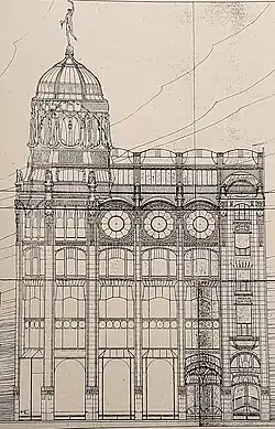 Po półtora roku prace budowlane zostały zakończone. Wzniesiono pięciokondygnacyjny secesyjny budynek o długości 120 metrów, o powierzchni 1200 m² i 8 tysięcy metrów kwadratowych powierzchni użytkowej[49]. Do jego budowy wykorzystano głównie kamień, żelazo i beton, konstrukcje były żelbetonowe, belki były nitowane. Fasada budynku została pokryta śląskim piaskowcem, żelazem, brązem i miedzią. Wszystkie prace były wykonane przez firmy miejscowe[50]. We frontowej elewacji od strony Rynku, pomiędzy dwoma skrajnymi pionami zwieńczonymi ogromnym odcinkowym łękiem-gzymsem, umieszczono całkowicie niemal przeszkloną fasadę, z której w dolnej części występował żelazno-miedziany kiosk. Fasada boczna była podobnie przeszklona, a brzegi płyt stropowych zostały ukryte za złotymi mozaikami[51] autorstwa Johana Odorico z Berlina[52]. Dwukondygnacyjny dach budynku miał konstrukcje stalową-kratownicową i pokryty był dachówką i miedzią[53]. Od strony ul. Kurzy Targ był zwieńczony czterema, pokrytymi miedzianymi hełmem, wieżami zwieńczonymi wielkimi miedzianymi wazonami udekorowanymi żelaznymi kutymi balustradami (do strony Szewskiej wieża zakończona była płaskim tarasem). W dachach umieszczono duże połaciowe okna doświetlające pracownie i pomieszczenia magazynów[52].