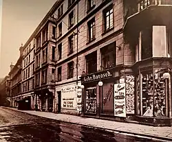 - ↑ Zdjęcie rogu zaułka Winogronowego i ulicy Oławskiej, gdzie po lewej stronie znajdował się sklep braci Baraschów.