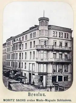 Właścicielem domu towarowego był Moritz Sachs, żydowski potentat finansowy[4][5]. Sachs był posiadaczem również kamienicy „Narożnik Zbożowy” (Kornecke) znajdującej się na rogu ulicy Oławskiej i Świdnickiej (obecnie nie istnieje), gdzie część budynku miała funkcje handlowe, część mieszkań było wynajmowane a górne apartamenty zajmował Sachs wraz z żoną i synami Leopoldem i Sigismundem[e]. Wygląd obu kamienic był inspirowany projektami berlińskiego projektanta Karla Friedericha Schinkla, twórcy projektu pałacu w Kamieńcu Ząbkowickim[30]. Nowo wzniesiony budynek Sachsa był pierwszym nowoczesnym domem handlowym we Wrocławiu o neorenesansowej elewacji[28]; w jej narożniku miał wykształcony, okrągły trzykondygnacyjny wykusz, przechodzący ponad dachem w płasko zakończoną wieżyczkę. Wzdłuż pierwszego i drugiego piętra budynek i wykusz obiegał balkon[31]. W budynku znajdował się dwupoziomowy sklep Moritz Sachs oświetlony dwukondygnacyjnymi witrynami. Na trzech kolejnych piętrach znajdowały się biura i mieszkanie właściciela[28].