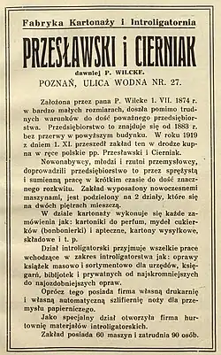 W lipcu 1874 roku rozpoczęła działalność fabryka kartonaży i introligatornia Paula Wilckego w Poznaniu. W 1883 roku zakład został przeniesiony do Pałacu Górków w Poznaniu przy ulicy Wodnej 27. Z dniem 1 listopada 1919 roku przedsiębiorstwo przeszło na własność Józefa Przesławskiego oraz Stanisława Cierniaka. Nazwę zmieniono z „P. Wilcke, Poznań” na „Przesławski i Cierniak. dawn. P. Wilcke”[1].