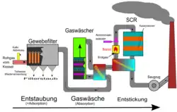 - tlenki azotu – w większości wypadków za pomocą systemów selektywnej redukcji niekatalitycznej lub wymagającej niższych temperatur selektywnej redukcji katalitycznej, w których dzięki zastosowaniu amoniaku (w przypadku redukcji katalitycznej lub niekatalitycznej) lub mocznika (w przypadku redukcji katalitycznej), dochodzi do redukcji tlenków azotu do wolnego azotu; mogą również być stosowane dodatkowe metody zmniejszające ilość azotu już w komorze spalania takie jak wstrzykiwanie tlenu lub recyrkulacja gazów spalinowych (wprowadzenie ich do komory spalania wraz z powietrzem wtórnym);