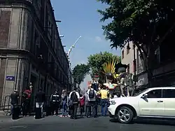 Po zakończeniu zdjęć w Rzymie produkcja przeniosła się do Meksyku, gdzie nakręcono sekwencję otwierającą film[66]. Jest to scena, która składa się z sześciu ujęć i była jedną z niewielu, które wymagały wcześniejszej wizualizacji[53]. Dzięki dokładnemu zaplanowaniu, nakręcenie nie wymagało użycia kamer motion control[53]. Sceny wymagały zamknięcia rynku miejskiego na czas kręcenia sekwencji walki na pokładzie helikoptera Messerschmitt-Bölkow-Blohm Bo 105CBS, w której wzięło udział 1500 statystów[44]. Po zakończeniu zdjęć w Meksyku, podczas zaplanowanej przerwy, Craig został przewieziony do Nowego Jorku, gdzie przeszedł operację kolana mającą na celu wyleczenie urazu[67]. Poinformowano, że nie miało to wpływu na filmowanie, a on sam powrócił na plan w Pinewood Studios zgodnie z planem 22 kwietnia[67]. Niektóre ujęcia w Meksyku zostały wykonane przy użyciu dublerów, których twarze zostały cyfrowo zastąpione twarzą Craiga[53].
