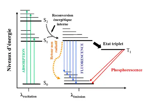 - fluorescencję – polegającej na przejściu ze wzbudzonego stanu S1, na stan podstawowy S0