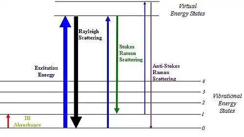 - Pasma antystokesowskie – jeśli przed oddziaływaniem z promieniowaniem molekuła znajdowała się na wzbudzonym poziomie oscylacyjnym, to oddziaływanie przenosi ją na podstawowy (zerowy) poziom oscylacyjny. Energia rozproszonego fotonu jest większa o różnicę energii poziomów oscylacyjnych hν. Pasmo antystokesowskie pojawia się w widmie Ramana po przeciwnej stronie co pasmo stokesowskie w stosunku do pasma Rayleigha. Pasmo to ma zwykle niższą intensywność niż pasma stokesowskie.