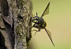 Samce osiągają od 11,1 do 15,2 mm, a samice od 11,5 do 14,7 mm długości ciała. Długość skrzydła wynosi u samców od 9,1 do 11,3 mm, a u samic od 9,8 do 11,7 mm[1]. Ubarwienie ciała jest czarne z żółtymi paskami[1][2]. Jest to mimikra względem przedstawicieli nadrodziny os[1].