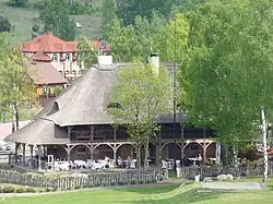 Data powstania obiektu wycięta jest na futrynie drzwi przejścia z sieni do pomieszczenia po lewej stronie (zwanej teraz Salą Zieloną), natomiast imię i nazwisko fundatora widnieje na zewnętrznej części futryny drzwi wejściowych od strony zachodniej (od ówczesnej części tarasowej). Budynek składa się z bardzo rzadko występującej w architekturze, konstrukcji zrębowej o dwóch kondygnacjach. Jest to budowla masywna, a wzdłuż jej dłuższych boków ciągną się również dwukondygnacyjne podcienia (galerie) arkadowe oparte na profilowanych słupach. Górne galerie są nakryte okapem wspartym na „rysiach”.