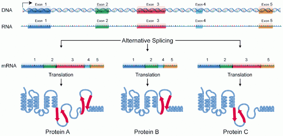 Rekord ilości możliwych wariantów splicingowych należy do genu Dscam Drosophila melanogaster, który może ich mieć 38 016[1]. Ocenia się, że od 35 do 75% ludzkich genów podlega alternatywnemu splicingowi[2].