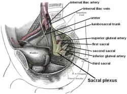 Splot podzielony jest na trzy odcinki – kulszowy, sromowy i guziczny. Od splotu wychodzą gałęzie krótkie i długie. Krótkie zaopatrują mięsień gruszkowaty, zasłaniacz wewnętrzny, oba bliźniacze i czworoboczny uda. Do gałęzi krótkich należą także gałęzie stawowe i gałęzie okostnowe.