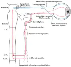 - gałąź współczulna do zwoju rzęskowego (łac. ramus sympathicus ad ganglion ciliare), prowadząca włókna do mięśnia rozwieracza źrenicy, mięśnia oczodołowego i mięśnia tarczkowego.