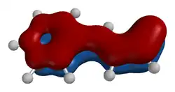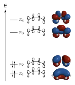 - π2 – wiążąca para elektronowa; elektrony zdelokalizowane w zakresach od C1–C2 i C3–C4 (odpowiednik klasycznego zapisu położenia wiązań zlokalizowanych)