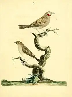 - ↑ Mayr, E.. The sequence of genera in the Estrildidae (Aves). „Breviora”. 287, s. 1–14, 1968.