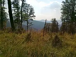 ![]() Widok z niebieskiego szlaku rowerowego na stoku góry Velké Bradlo–Z, na górę Srnčí vrch (2012 rok) | |