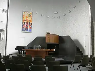 - stół komunijny umieszczony w części bocznej (jako kaplica boczna), ambona w środkowej części kościoła otoczona nawami schodzącymi się w jej kierunku – model rzadko spotykany dzisiaj, powszechny w czasach Reformacji.