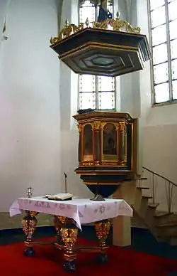 - stół komunijny położony z boku centralnie ustawionej kazalnicy, lub ambony (spotykany w wielu polskich kościołach baptystycznych),