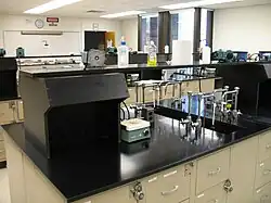 Stoły laboratoryjne pokryte są ceramicznym, metalowym lub drewnianym blatem, który musi być odporny na polewanie go żrącymi chemikaliami. Blaty stołów laboratoryjnych są zwykle umieszczane dość wysoko nad podłogą, gdyż pracuje się przy nich na stojąco lub siedząc na wysokich stołkach. Stoły są zwykle zaopatrzone w podstawowe instalacje – elektryczną, gazową, wodociągową i kanalizacyjną. Są one też zwykle zintegrowane z szafkami i półkami służącymi do przechowywania aparatury, próbek i odczynników.