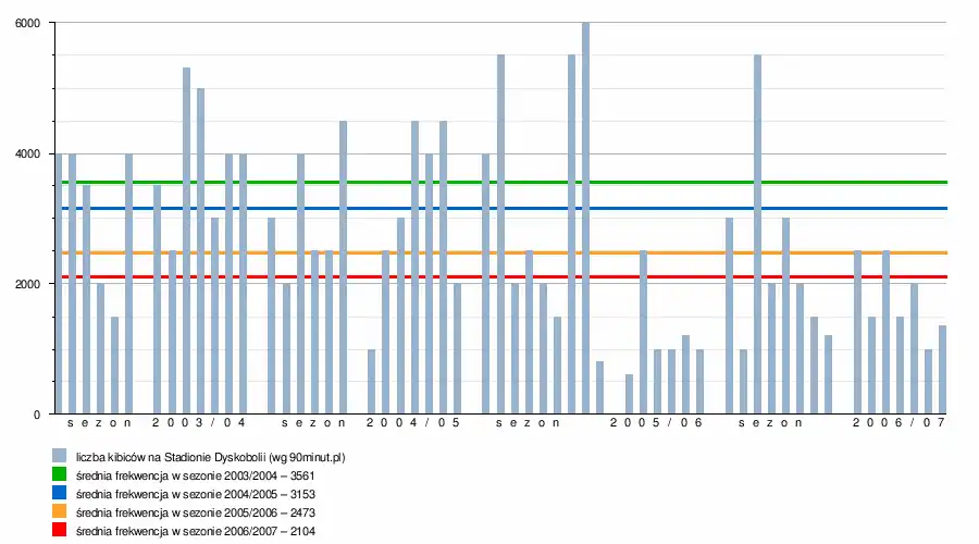 6100 widzów (19 października 2007 Dyskobolia – Lech Poznań) |