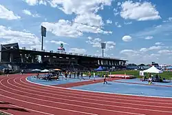 ![]() Stadion z powietrza, od południowego wschodu podczas rozgrywania mistrzostw Polski w lekkiej atletyce masters (2024) | |