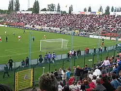 Trybuna północna (B, tzw. Niciarka) i południowa (D, popularny Zegar lub Młyn) powstały w latach 70. XX wieku. Trybunę wschodnią (C) zbudowano w latach 60., a powiększono w latach 70. i 80. ubiegłego stulecia. W latach 90. zrealizowano na niej żelbetowe schody wejściowe na koronę trybuny. Najbardziej zmodernizowana była trybuna zachodnia (A, tzw. Główna). W latach 1996–2000 przedłużono ją w kierunku południowym, całkowicie zmieniono geometrię przekroju i wykonano żelbetowe stopnie o wysokości 40 cm i głębokości 90 cm. Równolegle wykonano łącznik między trybuną a budynkiem klubowym i wspornikowe zadaszenie części trybuny o wysięgu 15,5 m. Zadaszenie oparte było na fundamentach studniowych o głębokości ok. 6 m. Pod łącznikiem został wykonany wjazd na płytę boiska, przeznaczony dla pojazdów specjalnych[37].