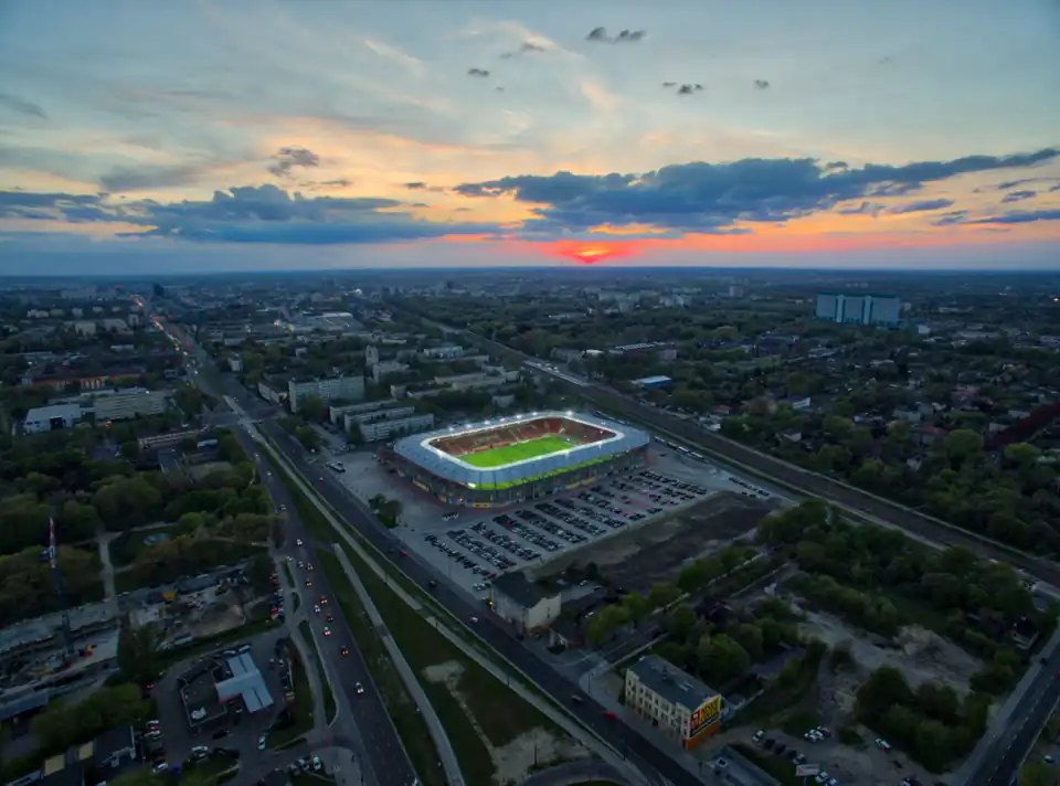 - Panorama 360° nowego stadionu (w budowie) na stronie dronhd.pl. dronhd.pl. [zarchiwizowane z tego adresu (2016-02-24)].