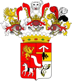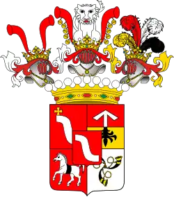 Herb z nadania 14 stycznia 1783: Tarcza czterodzielna w krzyż z polem sercowym. W polu I topór srebrny z rękojeścią złotą (Topór); pole II dzielone w pas czerwono-złote, od góry rogacina srebrna, przechodząca od dołu w ogon orła czarny (Niesobia); w polu III, czerwonym koń kroczący srebrny z popręgiem czarnym (Starykoń); w polu IV, srebrnym trzy trąby czarne w gwiazdę ustnikami do środka, o okuciach i sznurach złotych (Trąby); w polu sercowym, czerwonym, krzywaśń srebrna. Na tarczy korona hrabiowska, zaś nad nią trzy hełmy z klejnotami: I między dwiema trąbami czerwonymi wylotami ku górze, każda z pięcioma dzwoneczkami złotymi, lew siedzący na wprost, srebrny; II topór jak tarczy, wbity; III cztery pióra strusie: złote, czerwone, srebrne, czarne. Labry: I czerwone z prawej podbite srebrem, z lewej złotem; II czerwone podbite srebrem; III czerwone podbite złotem. Tarczę podtrzymują dwa lamparty.