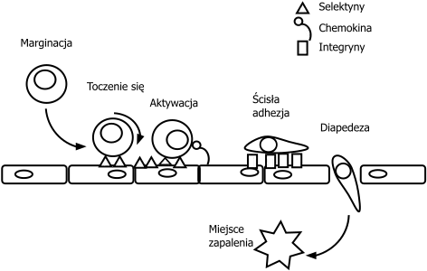 - diapedezę, czyli proces przechodzenia leukocytu przez barierę śródbłonka oraz tkankę do miejsca występowania antygenu.