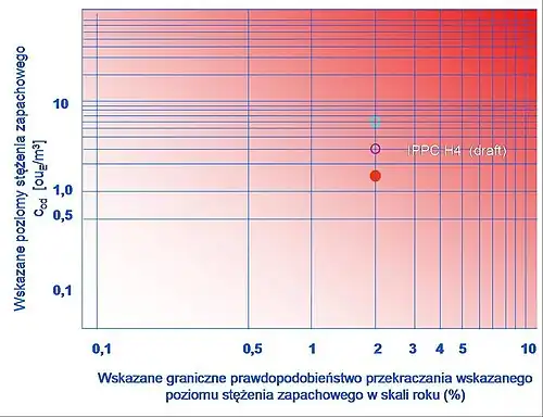- porównuje się wyniki obliczeń ze standardem, co pozwala wyciągnąć wnioski dotyczące poprawności lokalizacji[16]; zgoda na rozpoczęcie działalności jest – w razie potrzeby – warunkowana np. zmniejszeniem wielkości produkcji, zmianą sposobu wyrzutu gazów odlotowych (np. wyższy komin) lub zainstalowaniem bardziej skutecznych urządzeń do dezodoryzacji tych gazów