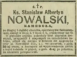 - ↑ Ks. Stanisław Albertyn Nowalski [nekrolog], "Kurjer Warszawski" : dodatek poranny 1909, nr 186, s. 3.