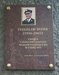 ![]() Fotografia portretowa Stanisława Dydka udostępniona na tablicy pamiątkowej ustanowionej w 2008 w Muzeum Pożarnictwa w Starej Wsi | |