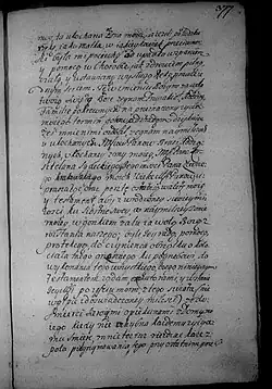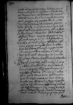 Do kościoła łazańskiego za Krakowem pod Wieliczką[n] w dobrach panów Kalinowskich quondam siostrzeńców moich rodzonych ordynuję zł 1000. O tym znieść się proszę z tamecznym JM księdzem plebanem, aby tej sumie pro commodo bliską siebie upatrzył lokacyją, a czynsz od tej sumy roczni był płacony perpetuis temporibus i zań Msze Święte za umarłych dusze proportionaliter. Kościołowi janińskiemu, jako parafijej mojej, z Balic, po dworze wytyczną dziesięcinę przyznawam, daję, która tylko piniężna bywała przedtym, hoc adiecto aby tu składana, a dworskie brogi fideliter, jako należy bywała, słomę na gruncie pro uberiori commodo ról tu zostawując. A przez tę wytyczną, dziesięcinę ma już, i [pieniężna] powinna być zniesiona. Upraszam przy tym, aby tak modernus JM ksiądz pleban, jako i inni po nim JM księża plebani nie byli gravaminosi sukcesorom, chyba by byli w słuszności samej renitentes.