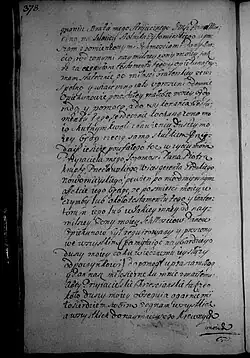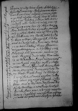 A że w takowym przyczynieniu ostatniej woli mojej razie przepomniałem za opiekunów upraszać i egzekutorów dla rady i pomocy ukochanej żonie mojej Jegomościów: JM księdza Dęmbińskiego kanonika krakowskiego[q] i JMP kasztelana oświęcimskiego, lubo dopiero hoc loco upraszam, ale do tamtego punktu o tym wyżej referuję i praecordialiter przy ostatnim tego świata rozstaniu proszę i żegnam wszytkich et vos miseremini mei.
