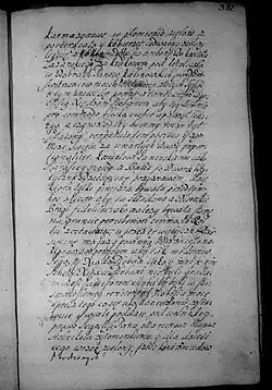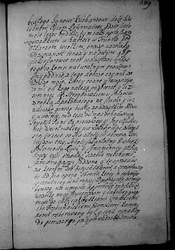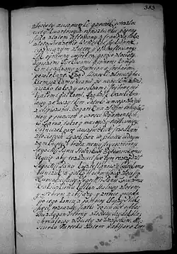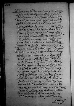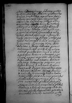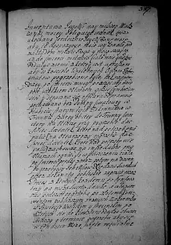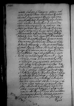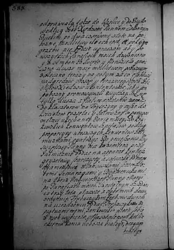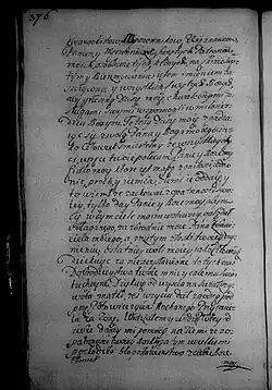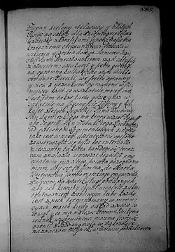 Zalecam na ostatek sług poddanych, aby ich który by chciał uwolnić z ukontentowaniem osobliwym, lubo każdy jest z nich terminowany w minucyjach moich, kiedy, odkąd zostaje, co wziął, i co ma należeć któremu. Wickiemu jednak, wychowańcowi mojemu, który się ożenił z poddaną moją w Zakrzowie, naznaczam młynek w Zalesiu pod Zakrzowem [s. 386] z polami i łąkami do młynka należącemi. Parę cielców do tego dobrych i źróbka ze stada, albo klacz dobrą, żeby tego używał wolno póty, póki mu sukcesorowie moi nie oddadzą zł 300, co mu ja nadaję i na tym młynku zeznawam i od wszelkich powinności uwalniam i zaszczycam, oprócz podatku Rzeczypospolitej, który od gromady płacić będzie powinien, co należy do tego; pałasz blachmalowy mój ordynuję i żupan atłasowy perłowy stary.