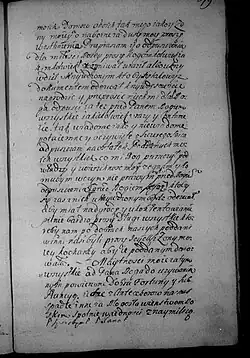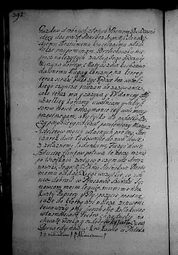 Majętności moje zatym wszystkie od Pana Boga do używania nam powierzone, dobra fortuny i substancyją, jedne z antecesorów na nas spadłe, inne za błogosławieństwem Boskim spólnie w jedności z najmilszą [s. 380] żoną nabyte, dożywotnim prawem wszystkie, a wszystkie, Jej Mości służą i o nie od sukcesorów moich za żywota Jej Mości żadna nie powinna być impetycyja. Stado bydła po folwarkach i dobrach naszych wolnej podaję dyspozycyi żonie mojej. Wiem, że nikomu na potym krzywdy nie uczyni. Dyspozycyje moje, które niżej w tym testamencie położone, rozporządzam, aby podług ostatniej woli mojej i tego testamentu ukochana żona moja rozsprawiła [z] miłością z którą szczerze przed Bogiem umieram obowiązuję.